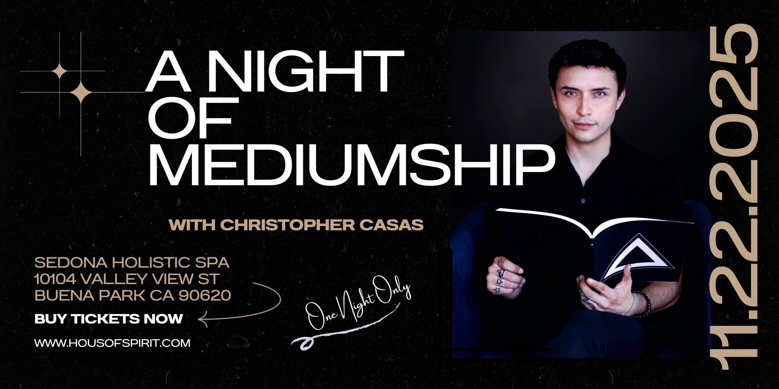 It’s that time of year! Join Orange County's Psychic Medium Christopher Casas as he connects you to your loved ones during an intimate night of audience readings! Christopher will provide evidential proof of life after death during these demonstrations. If you've been looking for a message, need a little guidance from those in spirit, or would simply like to experience how the soul lives on, Christopher would love to make the connection for you.